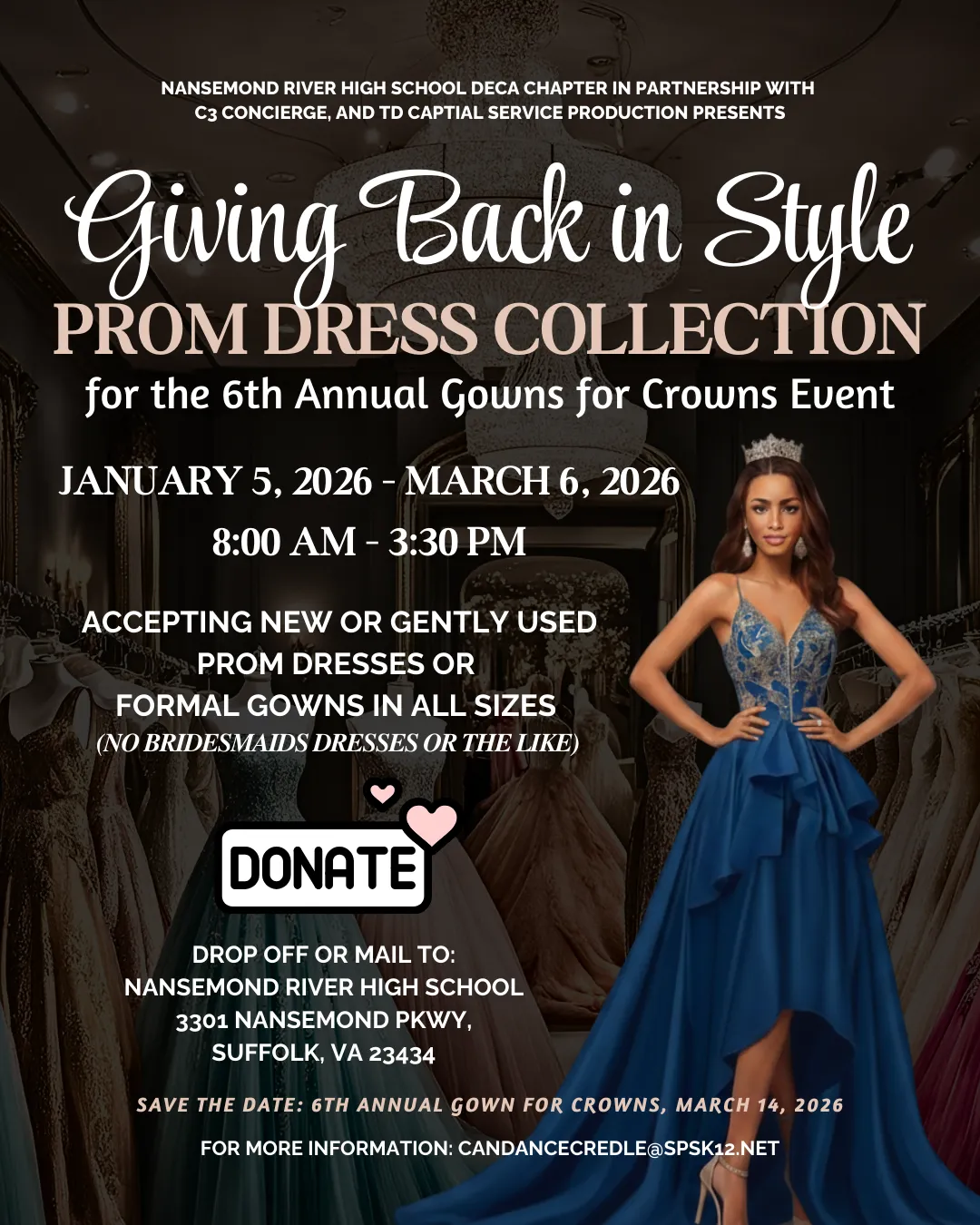 Gowns For Crowns is a Nansemond River High School DECA Chapter initiative dedicated to easing the financial strain associated with prom – a cherished high school milestone.